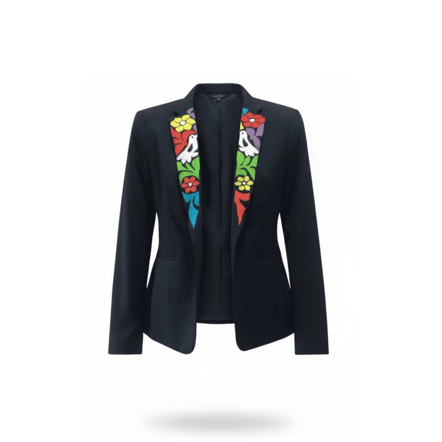 Blazer para mujer con bordado de San Felipe Jalapa de Diaz, realizado por las maestras artesanas de la región mazateca de Oaxaca. Pieza única que refleja elegancia y autenticidad.