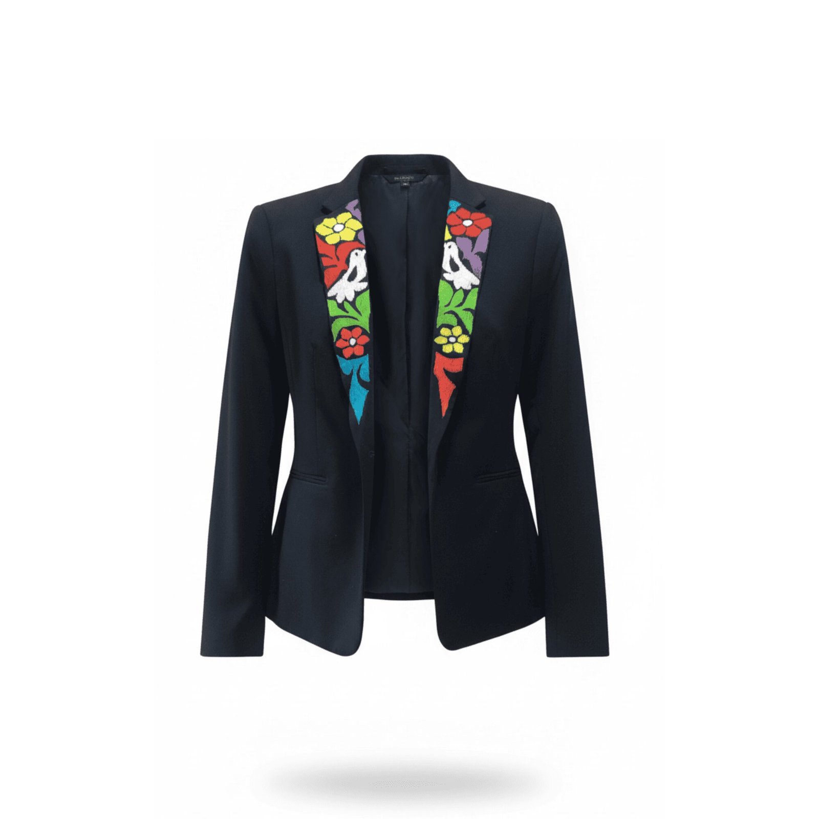 Este blazer para mujer con bordado de San Felipe Jalapa de Diaz resalta por su vibrante iconografía de aves y flores, característica de la región, plasmada en una rica paleta en gamas multicolor que incluye tonos rojos, amarillos, azules y verdes. Cada puntada sobre las solapas refleja la exuberancia de la naturaleza mazateca, creando un contraste impecable con la elegancia del textil oscuro.