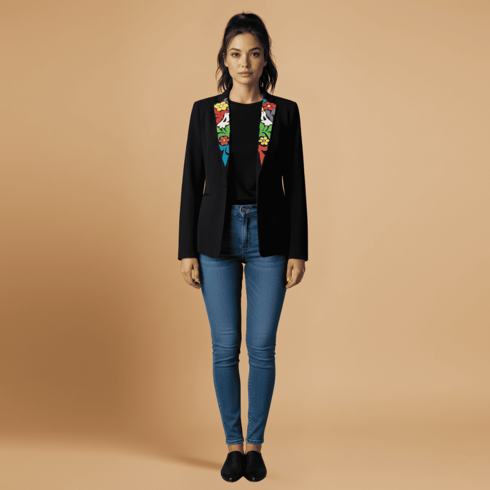 Nuestro blazer para mujer con bordado de San Felipe Jalapa de Diaz, en color negro profundo, destaca por su diseño sofisticado y profesional, integrando solapas bordadas a mano por las maestras artesanas de San Felipe Jalapa de Díaz, Oaxaca.