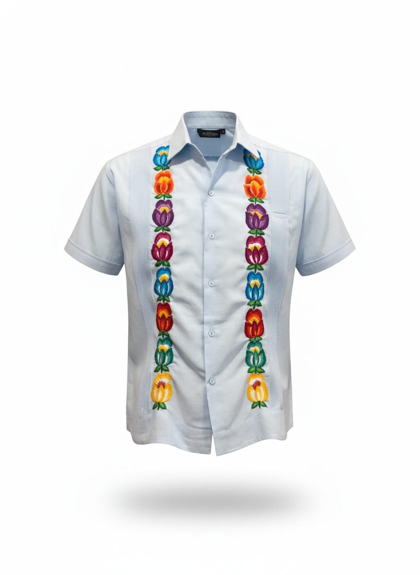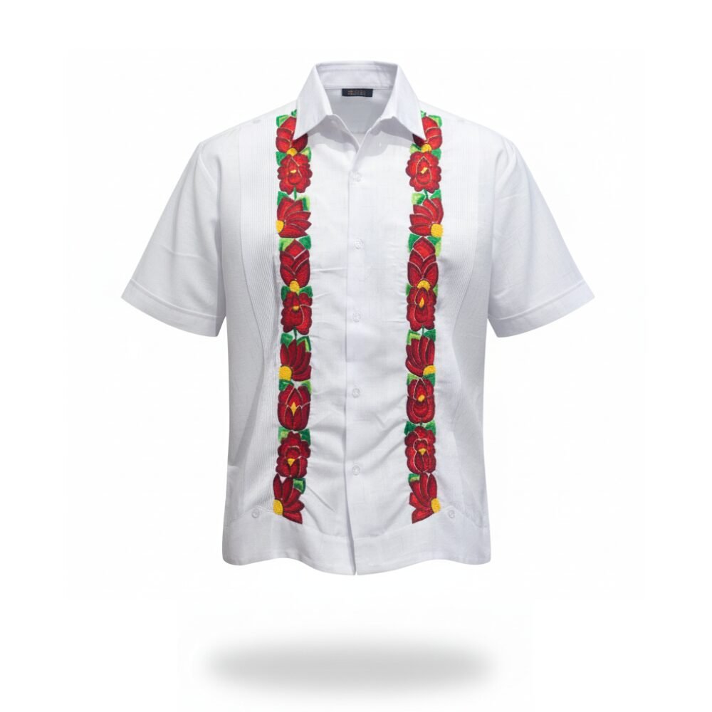 Guayaberas para caballero estilo manga corta presidencial y cuello camisero, acompañada de un fino bordado de flores realizada en técnica de aguja pequeña, creación de artesanas zapotecas del Istmo de Oaxaca.