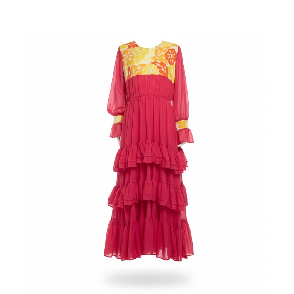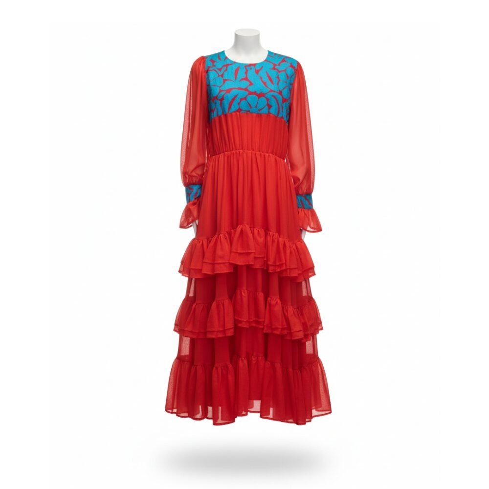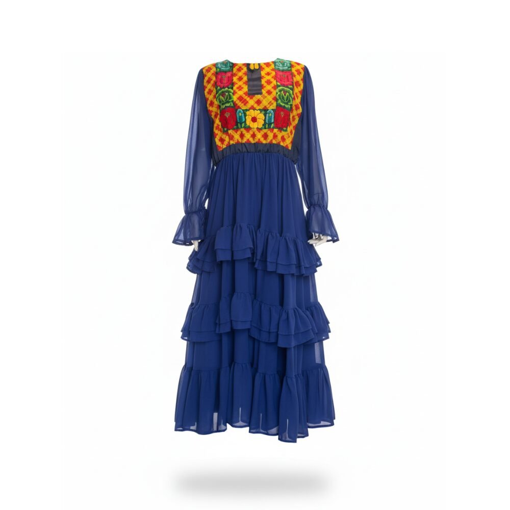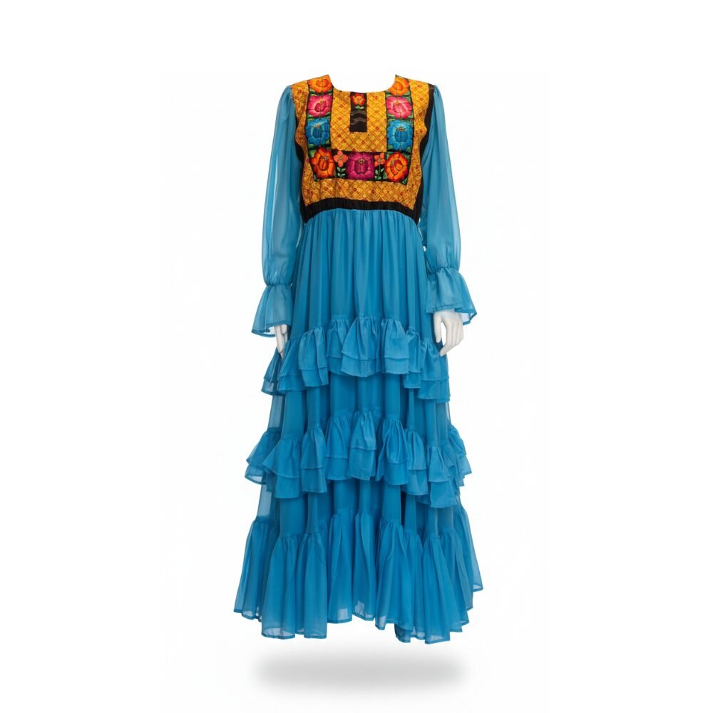 Nuestro maxivestido “Camila” es una pieza en corte circular. El diseño cuenta con diferentes tipos de bordados como los son de Jalapa de Díaz y del Istmo de Tehuantepec. La pieza esta acompañada con olanes en falda y puños.