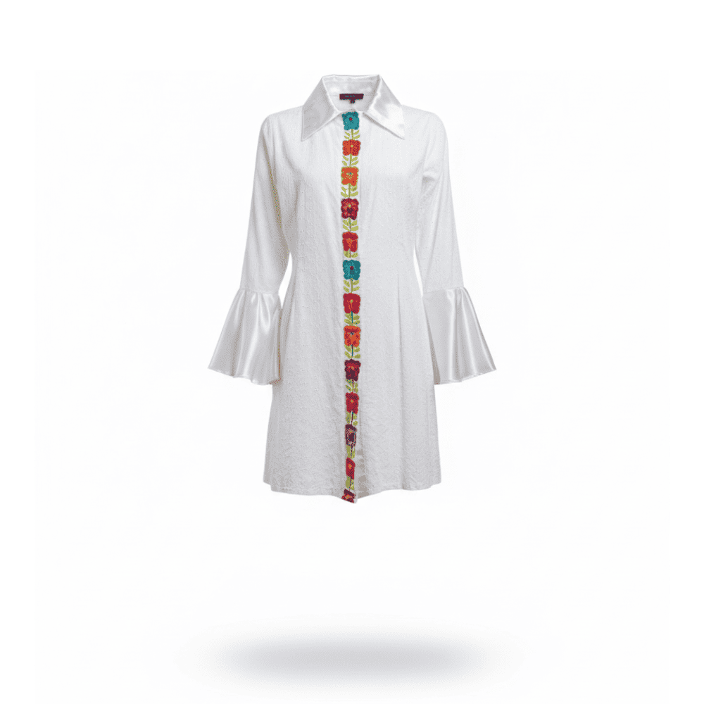 Mini dress con botonadura y tira de flores bordadas a mano. Olanes en manga larga y cuello camisero con satín. Vestido elaborado en algodón bordado. Nuestro diseño “Saraí” cuenta con una hermosa pechera bordada a mano por artesanas zapotecas en técnica de aguja pequeña, la cual puede demorarse en realizar hasta 30 días aproximadamente.