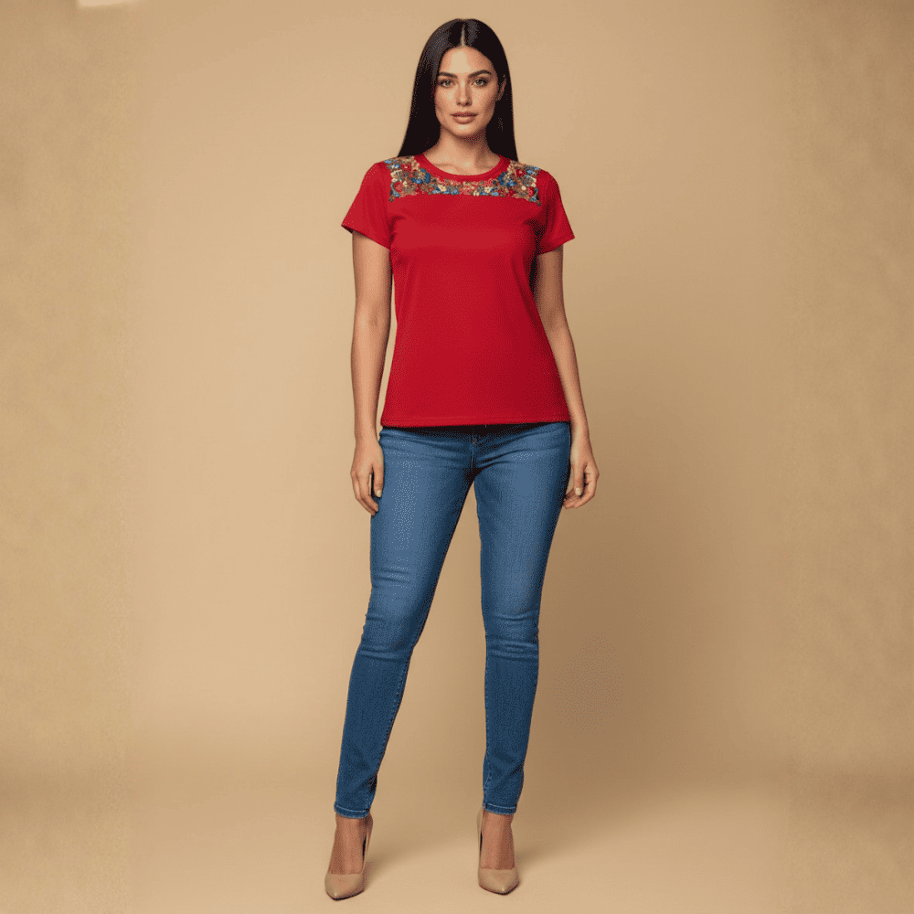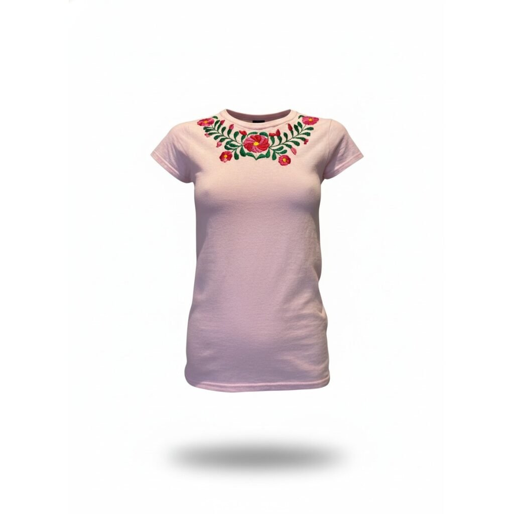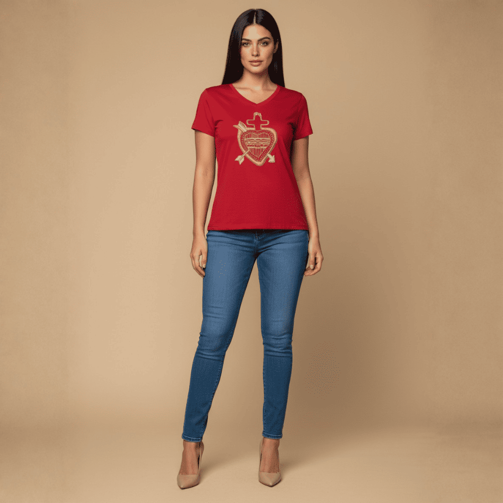 Playera de algodón en cuello V y redondo, con corazón de cristo, el cual esta bordado a mano por artesanas de San Antonino Castillo Velasco.