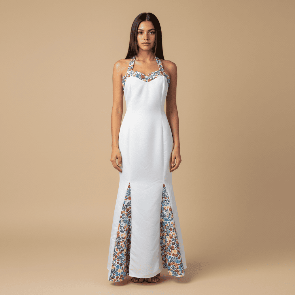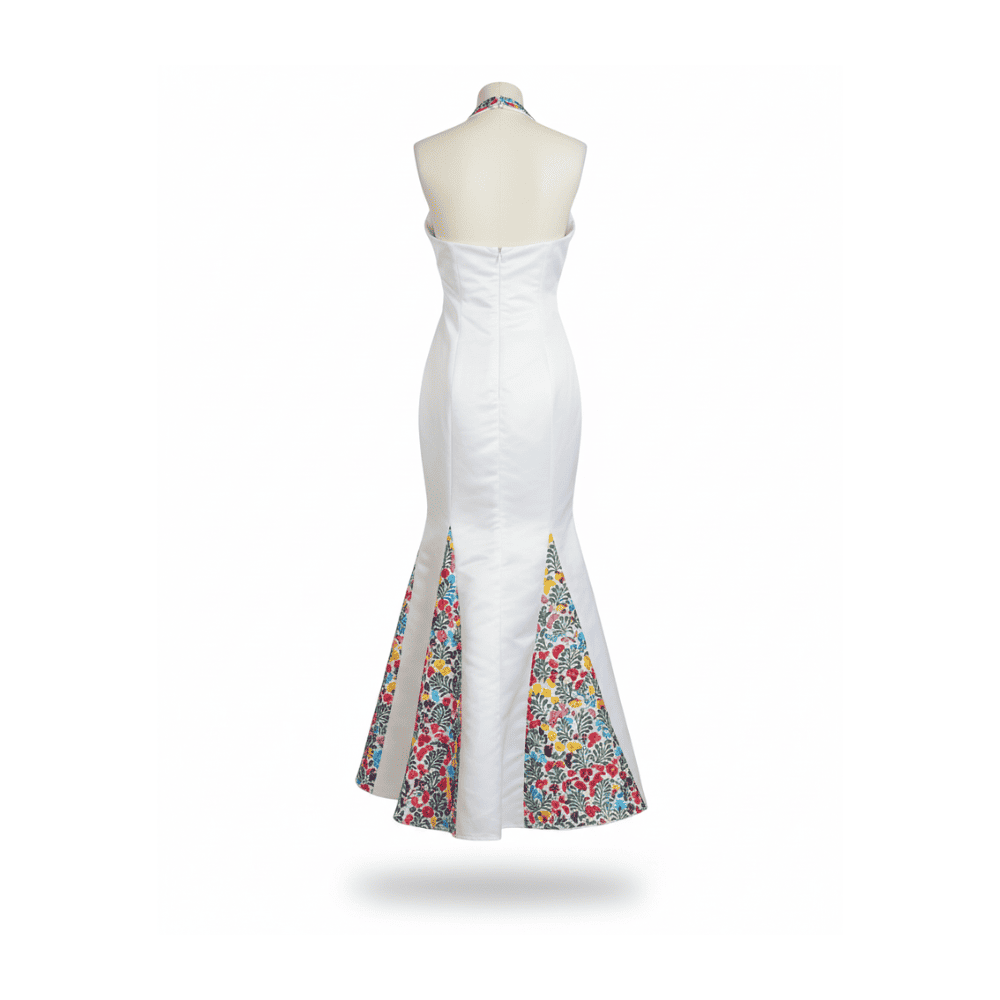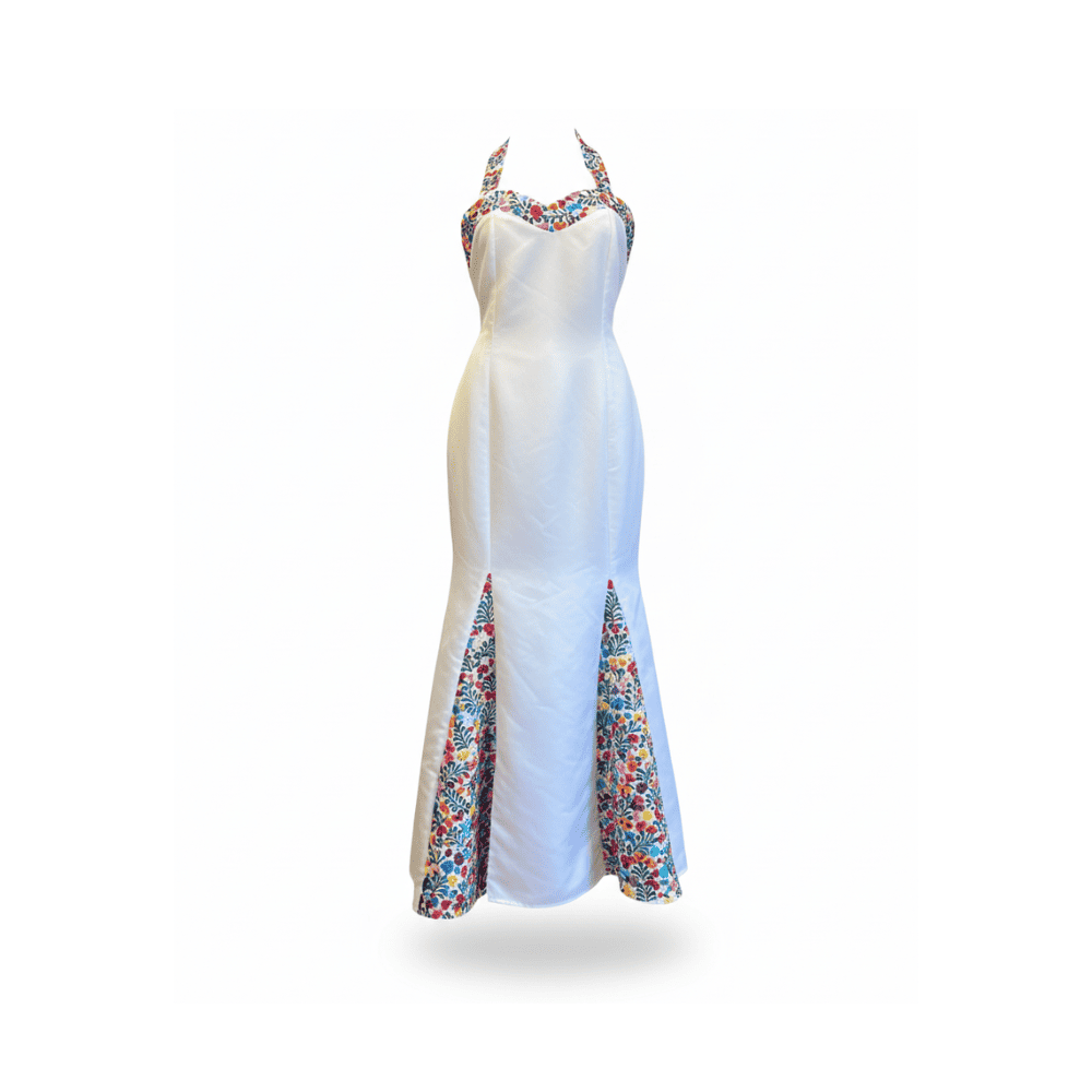 Vestido de novia color blanco confeccionado en tela de satín, con corte sirena que estiliza la figura y aporta un movimiento suave y elegante. Su diseño destaca por un bordado artesanal hecho completamente a mano por mujeres maestras artesanas zapotecas de San Antonino Castillo Velasco, Oaxaca, reconocidas por su maestría en flores bordadas y detalles delicados que dan vida a cada pieza.
