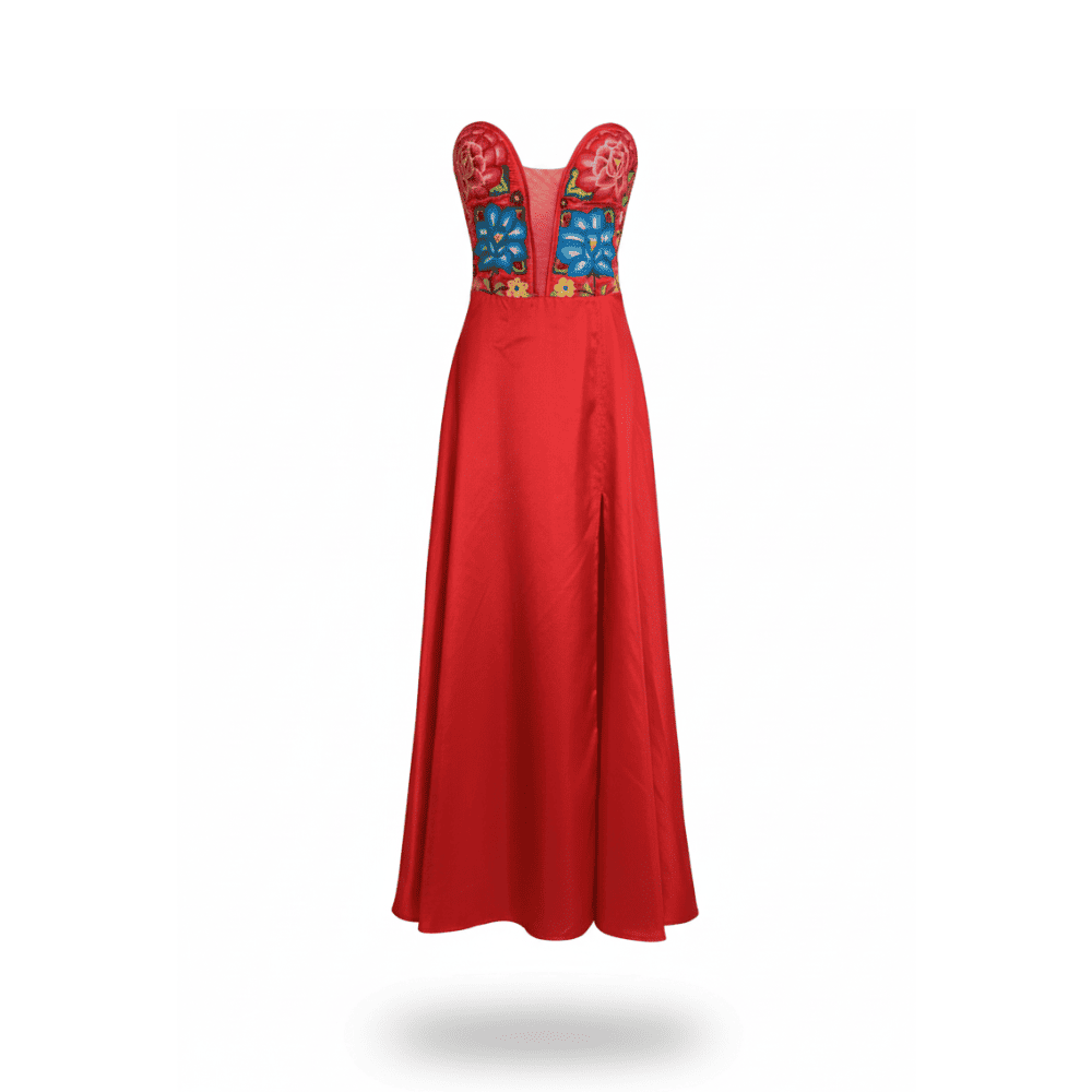 Vestido de noche largo con apertura en pierna izquierda y corset. La tela es satín en color rojo. El corset cuenta con flores multicolor las cuales están bordadas por artesanas del Istmo de Tehuantepec en técnica de gancho. Esta pieza demoró 60 días en realizarse.