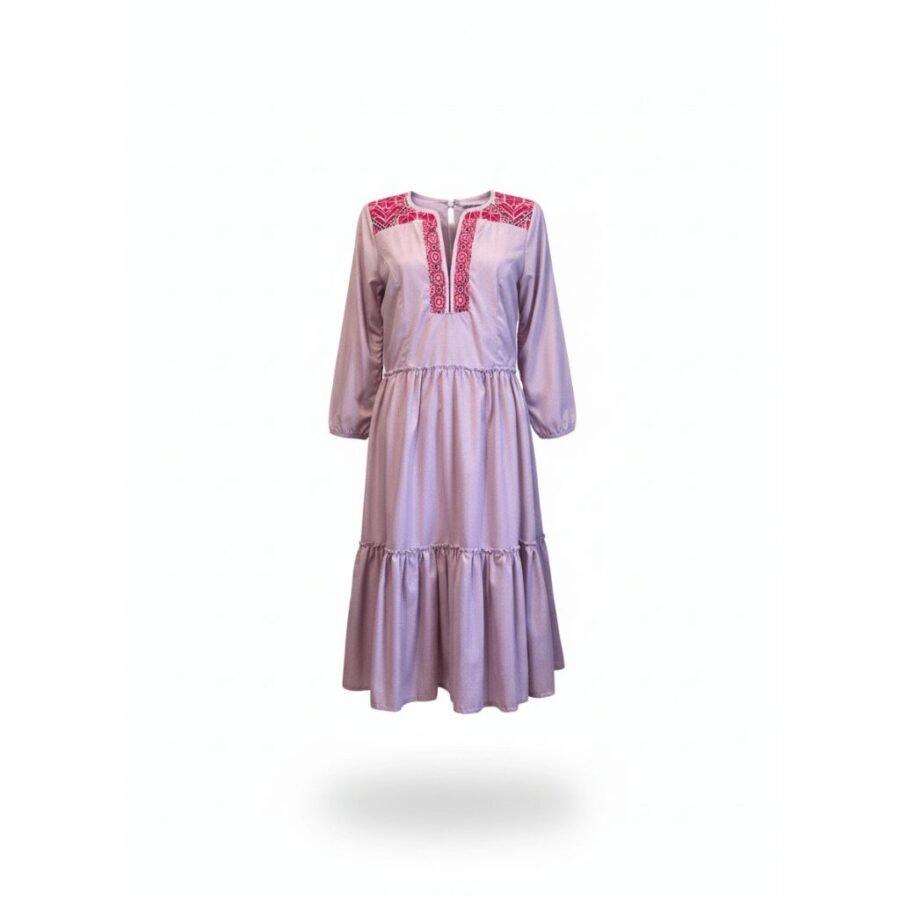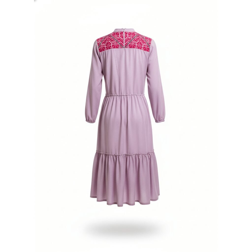 El vestido Amanecer de Coatlán es una pieza de alta costura artesanal que fusiona la serenidad del tono lavanda con la fuerza del bordado tradicional de la Sierra Sur. Su diseño destaca por una silueta de corte midi con falda de tres tiempos, que aporta un movimiento fluido y elegante, ideal para quienes buscan una prenda que equilibre la distinción contemporánea con un profundo legado cultural.