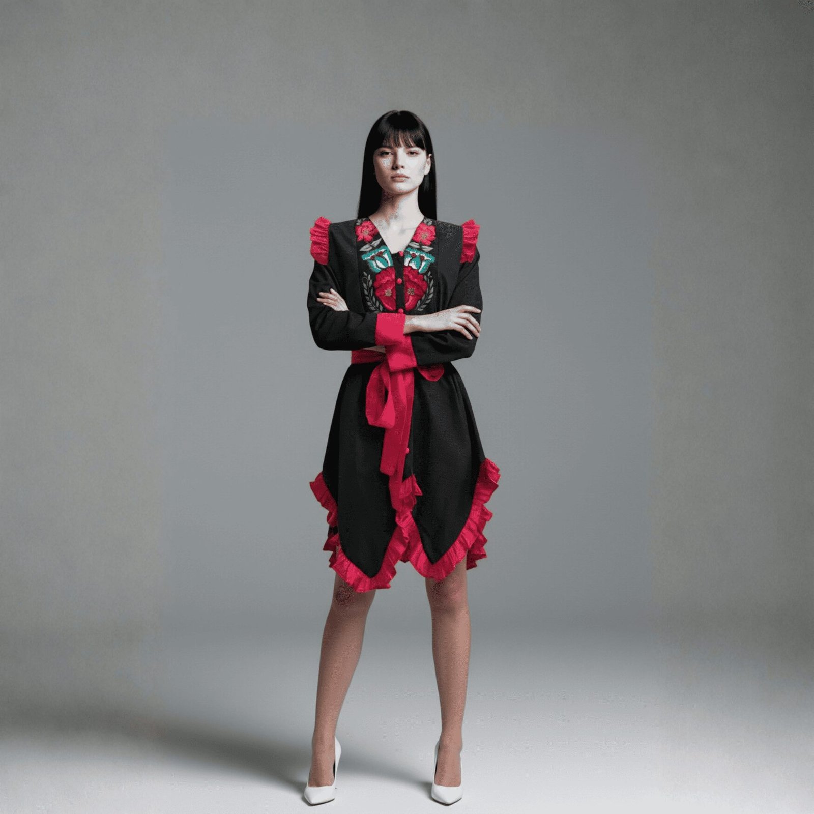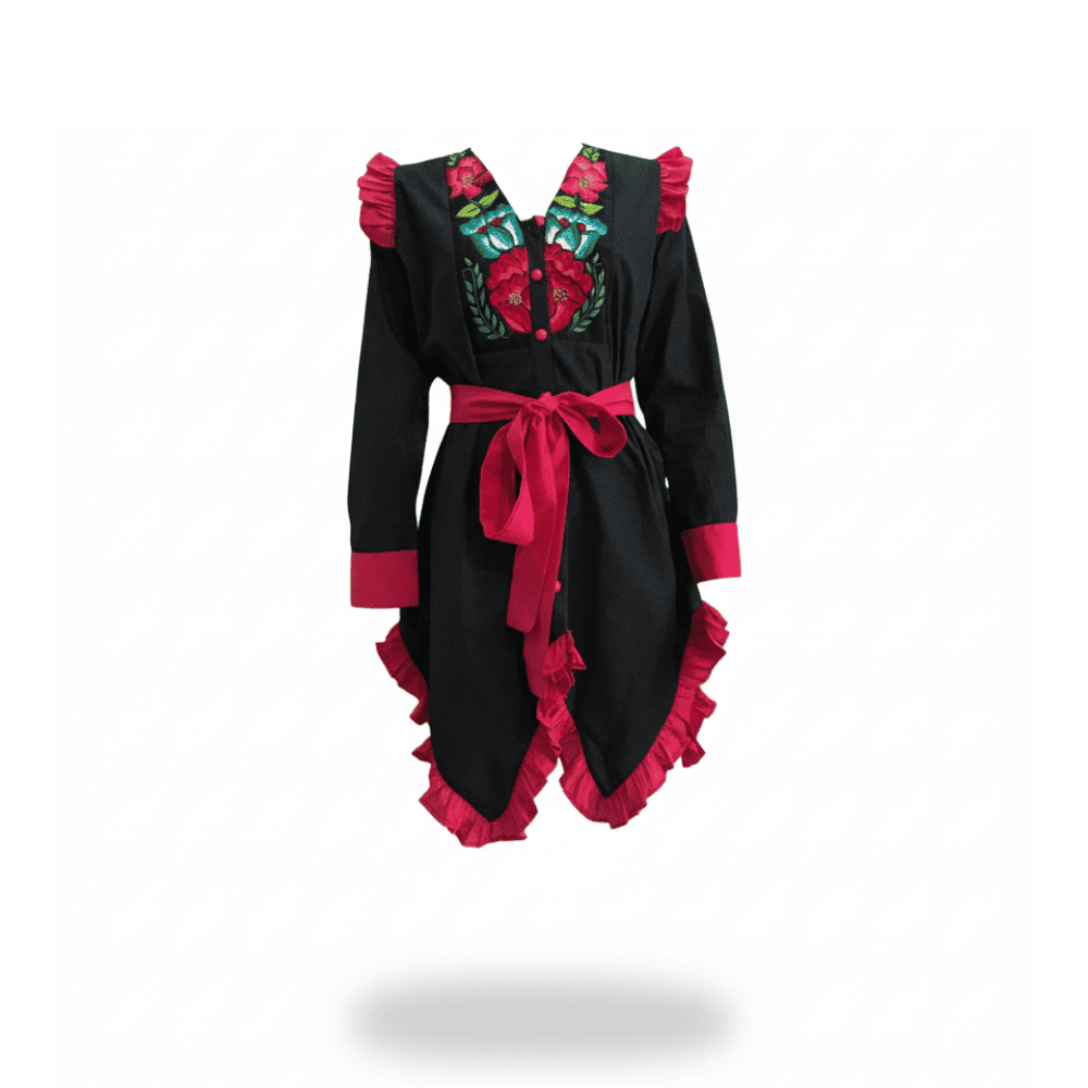 El vestido corto con olanes fucsia bordado artesanal es una pieza que combina tradición, color y estilo contemporáneo. Su diseño destaca por una falda con olanes en tono fucsia, hombreras marcadas y puños en el mismo color, creando un contraste vibrante y femenino. Incluye un cintillo fucsia que resalta la cintura y aporta equilibrio visual al conjunto.