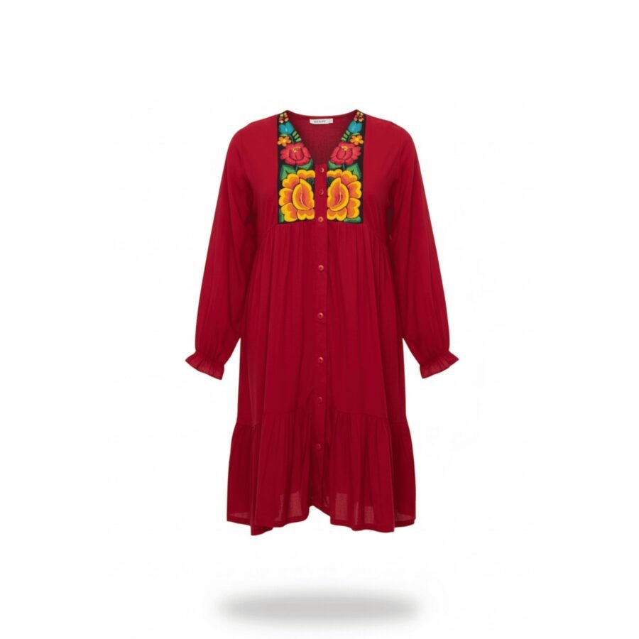 Nuestro vestido camisero casual con bordado hecho a mano por las maestras artesanas del Istmo de Tehuantepec, es una pieza excepcional que rinde tributo a la majestuosidad de la región del Istmo. Esta pieza esta confeccionada en un vibrante tono rojo carmesí, el cual destaca por su exquisito bordado de flores de gran tamaño, característico de la región, realizado con la técnica de aguja de mano.