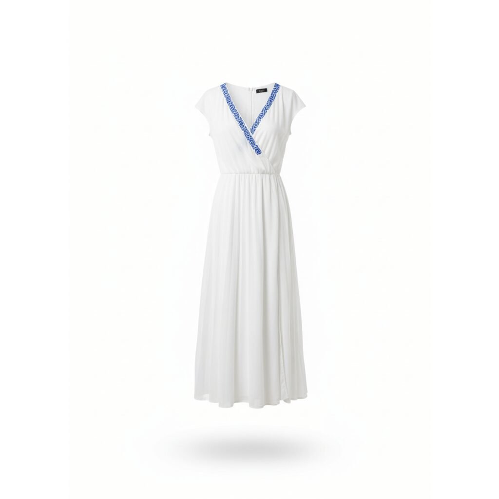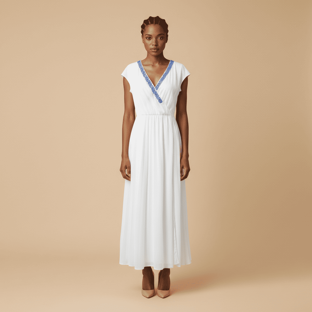 El vestido cruzado casual con bordado de San Vicente Coatlán “Brisa”, esta diseñado para destacar en ambientes playeros y climas cálidos. Confeccionado en rayón en color blanco, proyecta frescura con su corte largo y fluido, la cual, presenta un favorecedor escote cruzado en “V” que estiliza la silueta, haciendola una pieza única.
