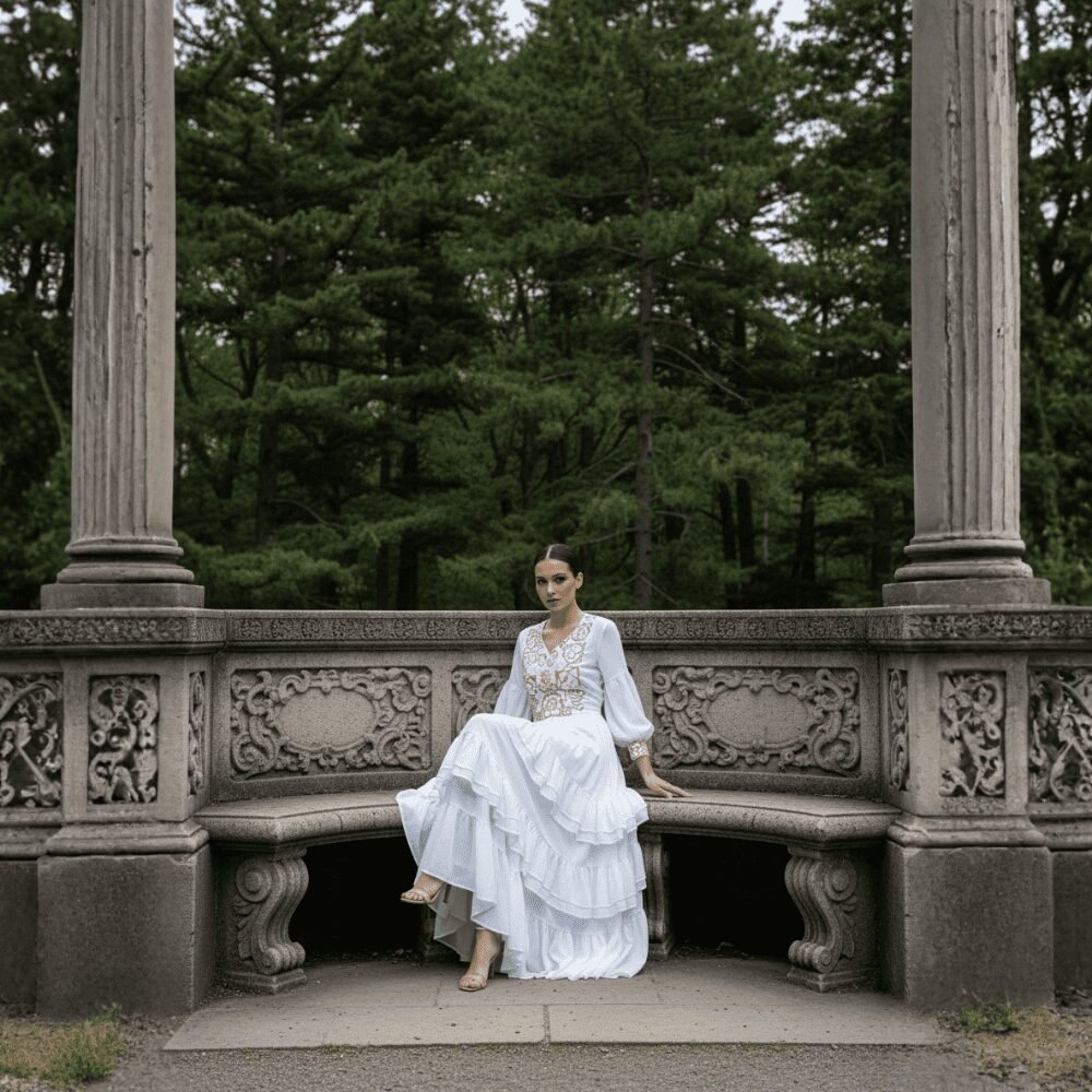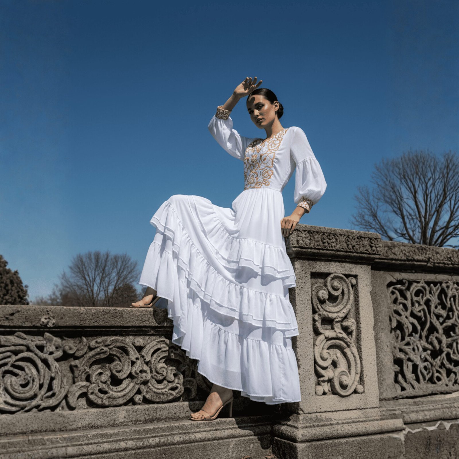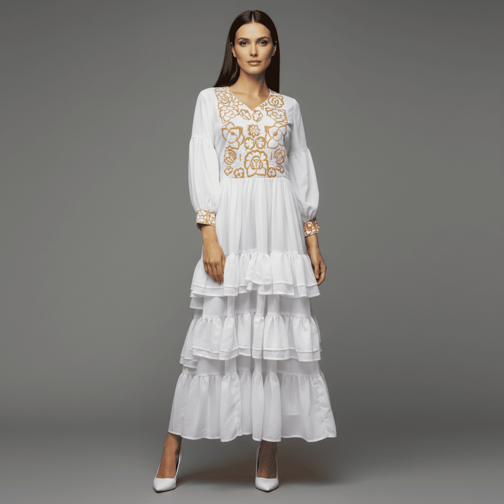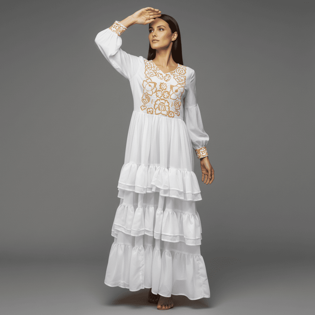 Este exclusivo vestido de novia de chiffon en color blanco combina elegancia contemporánea con un toque artesanal distintivo. Su falda circular con delicados olanes brinda movimiento suave y una silueta romántica, ideal para ceremonias al aire libre, bodas civiles o celebraciones tradicionales.