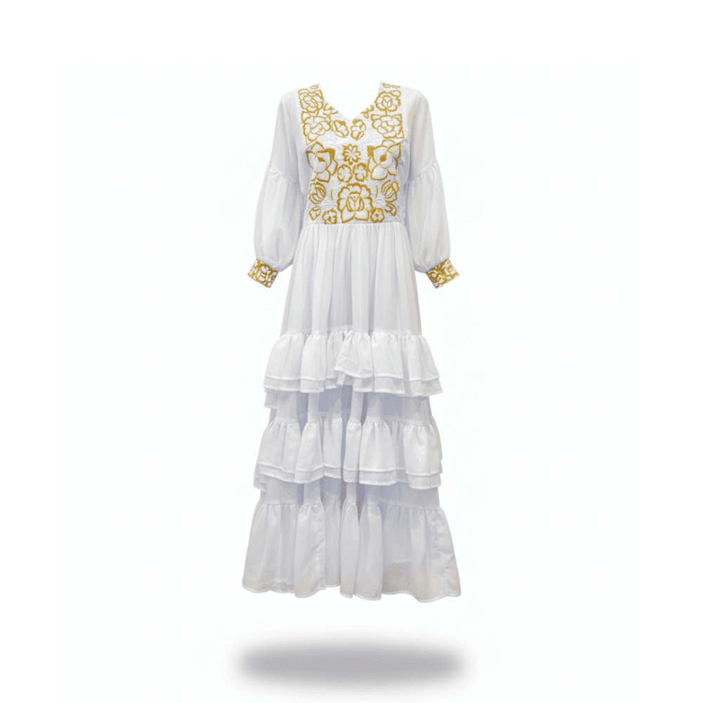 Vestido de novia blanco elaborado en chiffon ligero, con falda circular de olanes y cuello redondo. La pechera destaca un fino bordado dorado de siluetas florales, hecho a mano en técnica de aguja pequeña con hilo iris por artesanas de Istmo de Tehuantepec. Una pieza elegante, artesanal y de edición especial.