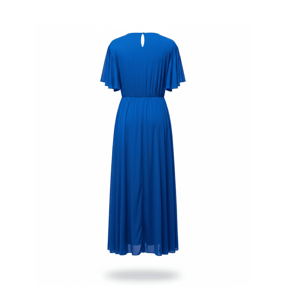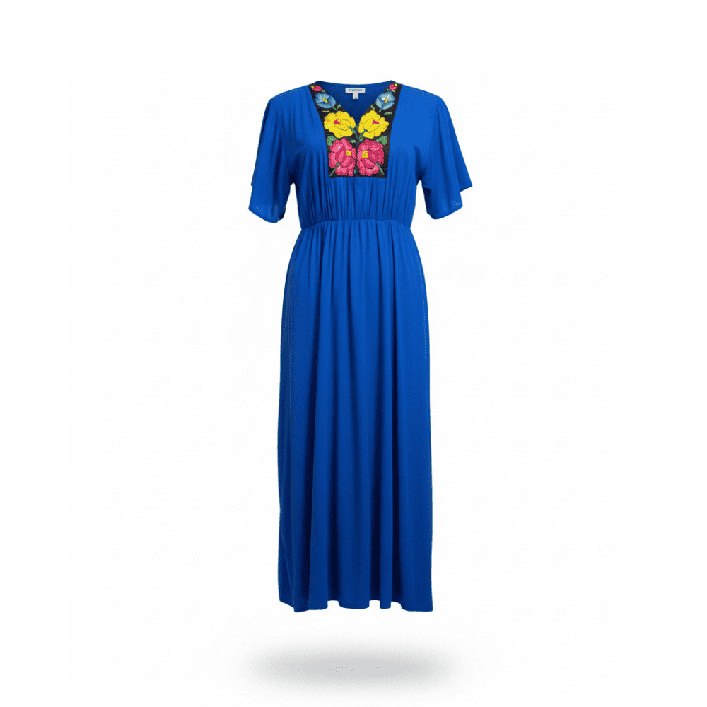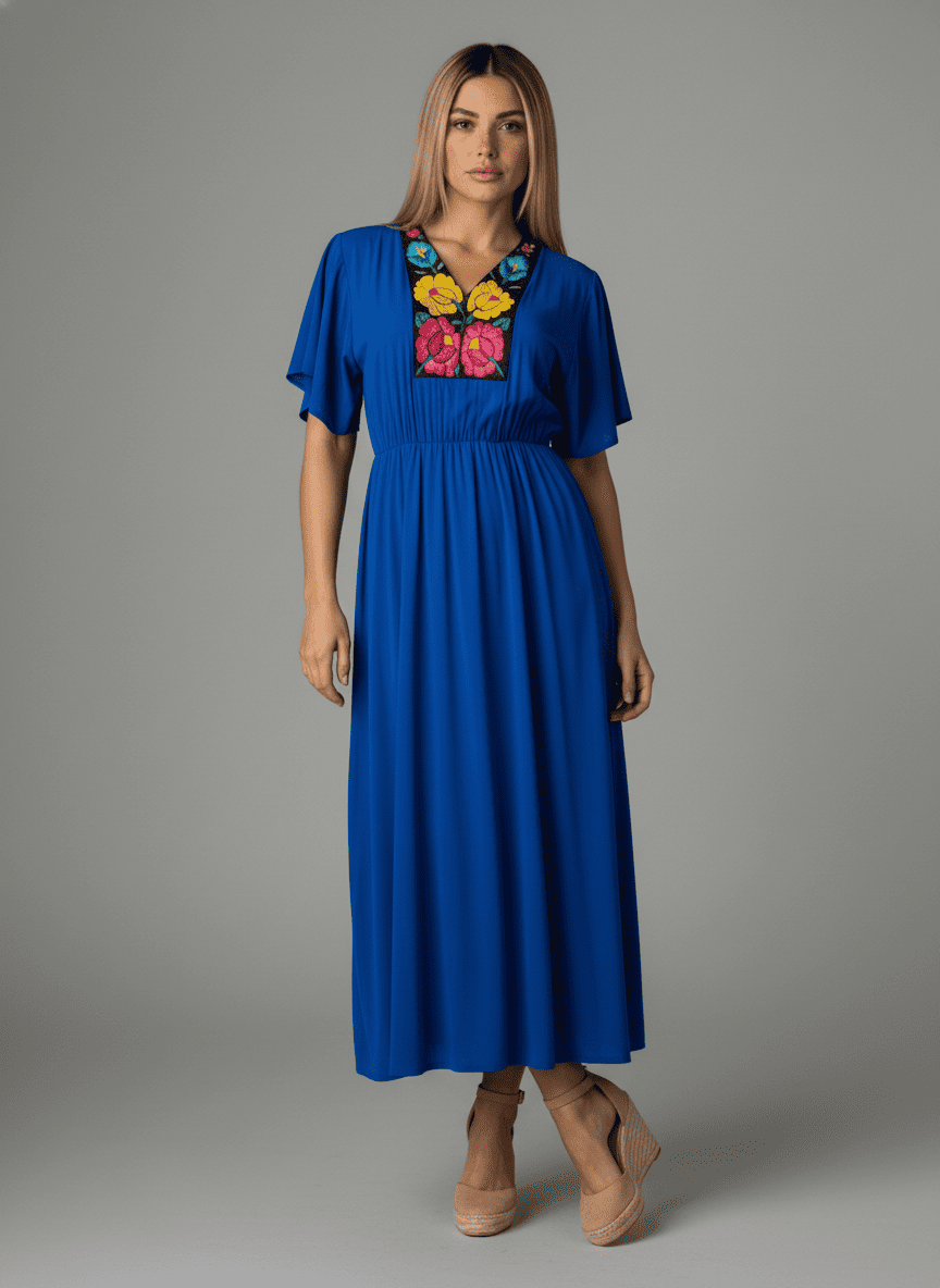 Luce fresca y elegante con este vestido largo casual en rayón azul rey, diseñado en talla plus size para realzar la silueta con comodidad y estilo. Presenta mangas cortas con olanes y un hermoso bordado multicolor artesanal en técnica de aguja pequeña, elaborado por artesanas del Istmo de Tehuantepec, que aportan un toque auténtico de la moda tradicional mexicana.