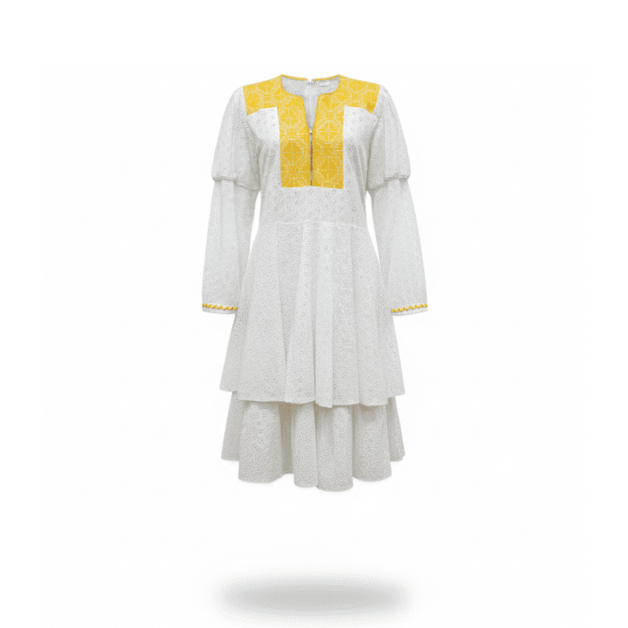 Vestido largo hasta el tobillo en algodón bordado, con mangas largas y delicado bordado en puños. Presenta botonadura en el pecho y cierre oculto para un acabado limpio. Su bordado en color amarillo, elaborado a mano en punto de cruz por artesanas de San Vicente Coatlán, convierte esta pieza en una expresión auténtica de la tradición textil oaxaqueña.