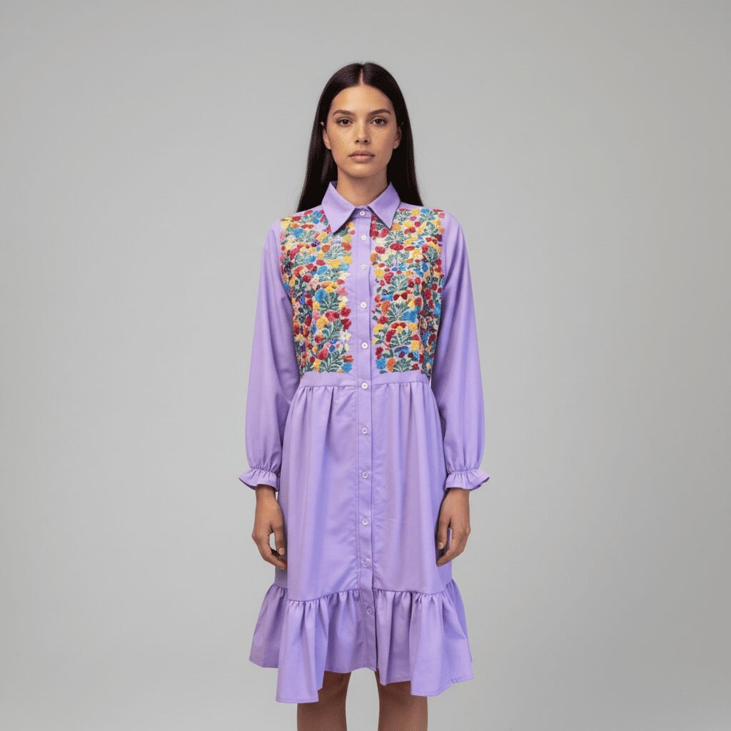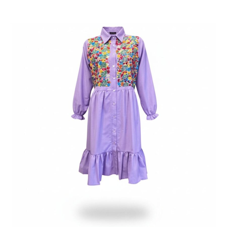 Vestido corto casual, confeccionado en lino italiano, mangas largas y cuello inglés. El bordado esta elaborado a mano con hilo de seda. Creación de artesanas zapotecas de San Antonino Castillo Velasco.