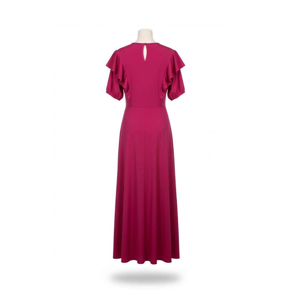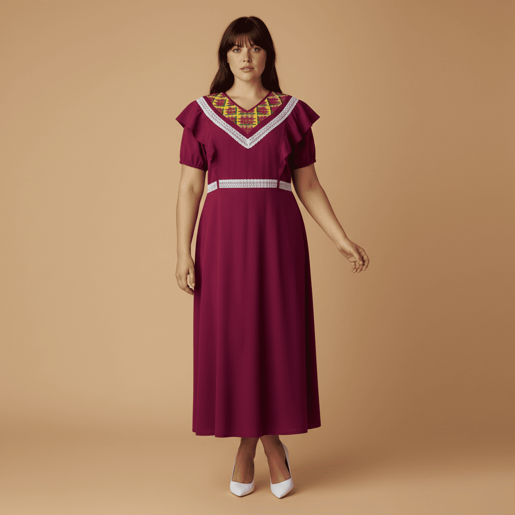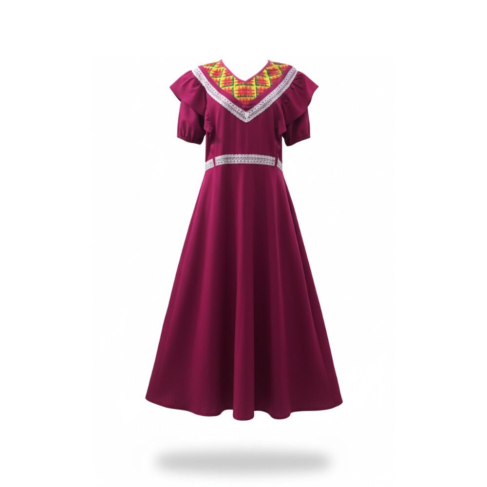 Nuestro vestido largo de algodón con bordado del Istmo “Soberana”, es una pieza que captura la energía de la región del Istmo de Tehuantepec. Confeccionada en un algodón en tono bugambilia, este vestido cuenta con mangas cortas, olanes en escote “V”, detalle en cintura y una falda corte semi circular.
