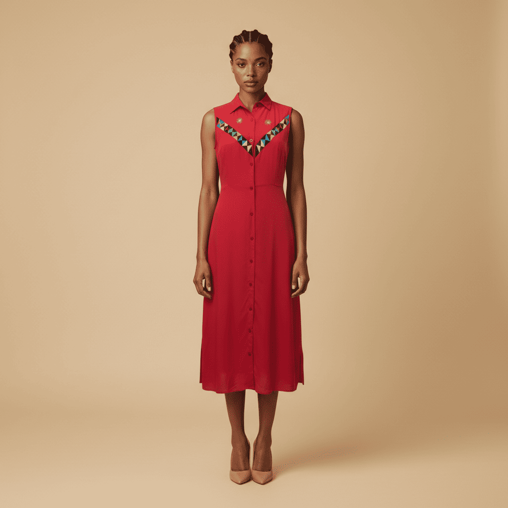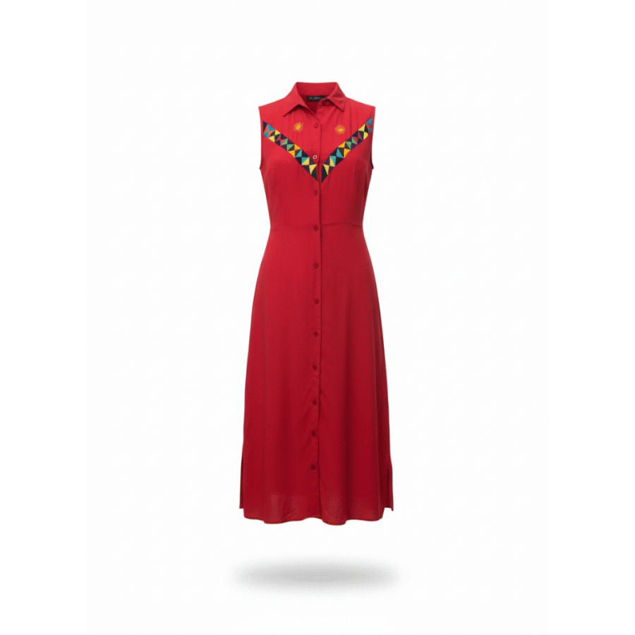 El alma de este vestido largo camisero con bordado de Huazolotitlánda, reside en un minucioso bordado de alta precisión técnica, característico de la región. Esta pieza presenta un patrón geométrico en forma de “V” que resalta sobre el pecho, donde hilos en tonos amarillos, azules y negros crean una armonía visual que evoca los colores de la naturaleza costera.