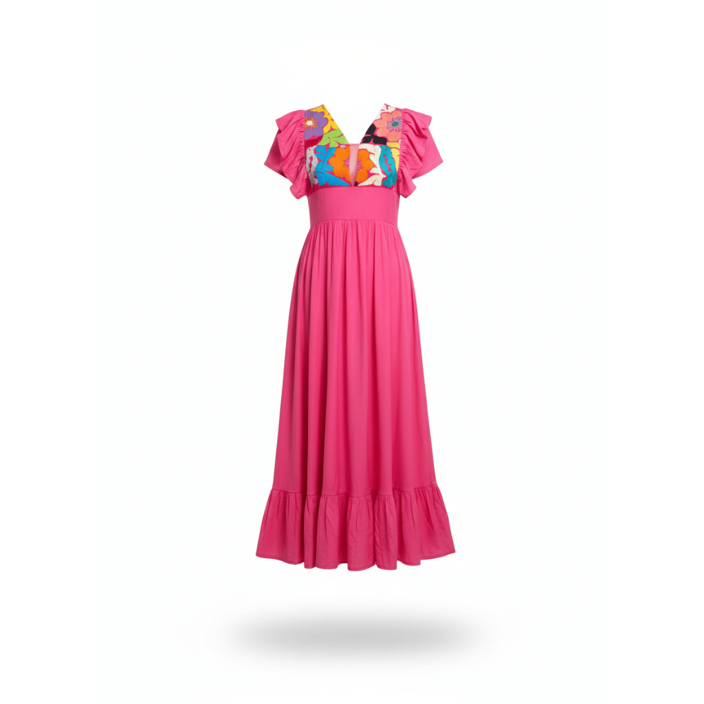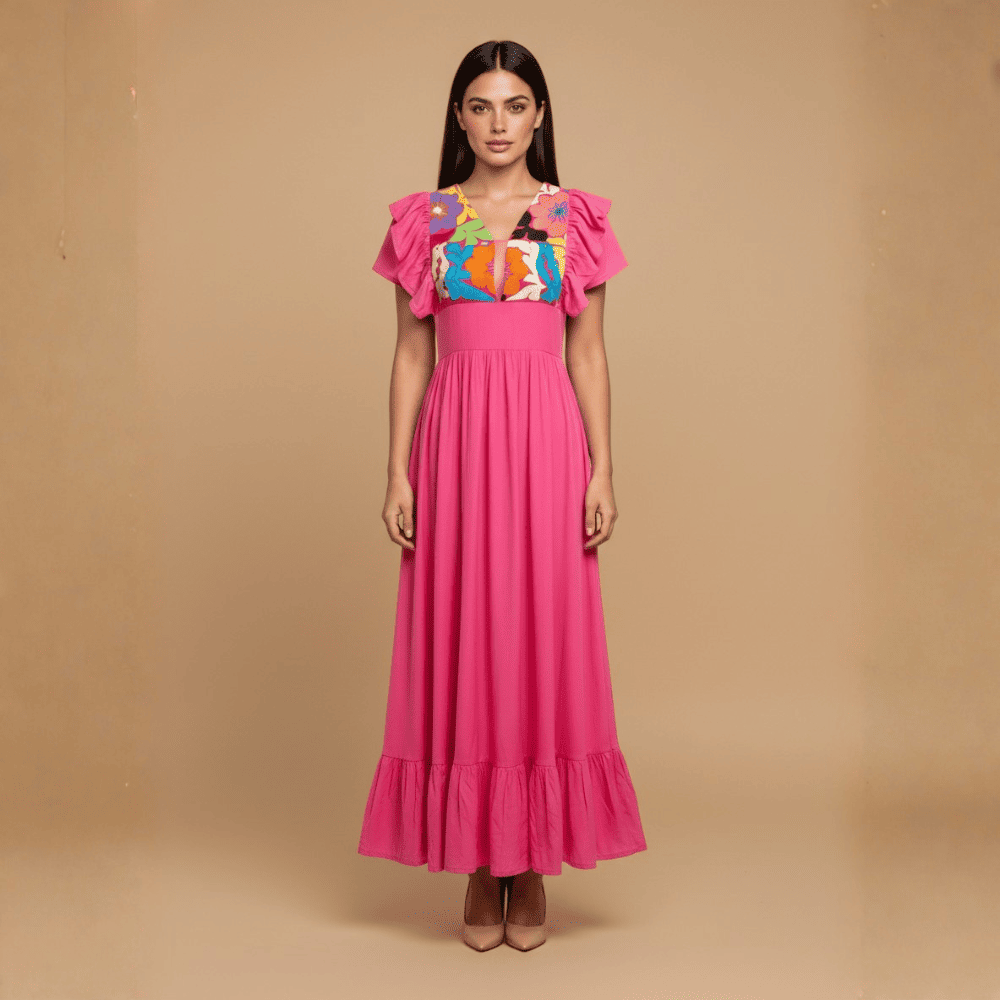 Nuestro vestido largo casual con bordado de Jalapa de Díaz, es una pieza que fusiona el rosa mexicano con la maestría textil del bordado tradicional elaboro por las maestras artesanas de San Felipe Jalapa de Díaz, Tuxtepec. La silueta de este vestido largo casual con bordado de Jalapa de Díaz, destaca por un corte femenino de talle definido, mangas de olanes, cuello en “V” y una falda maxi de caída fluida, creando una presencia sofisticada e inolvidable. Esta pieza esta elaborada en lino.