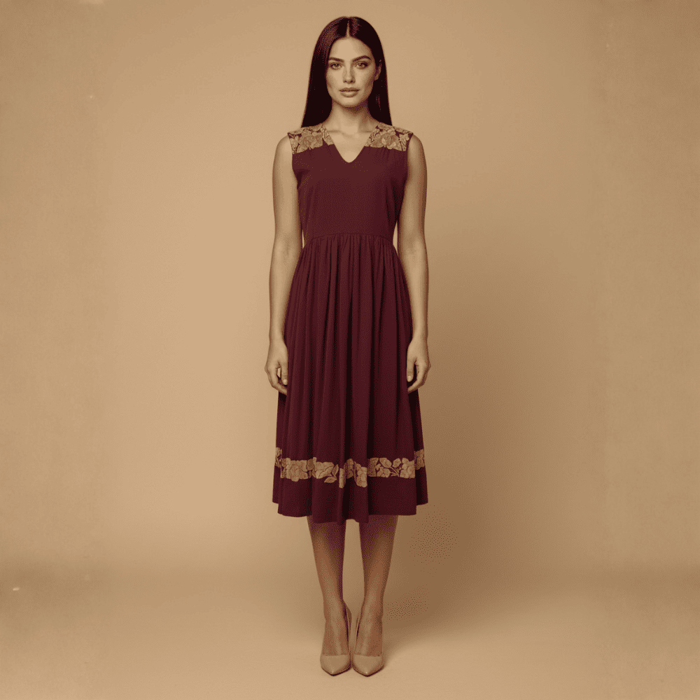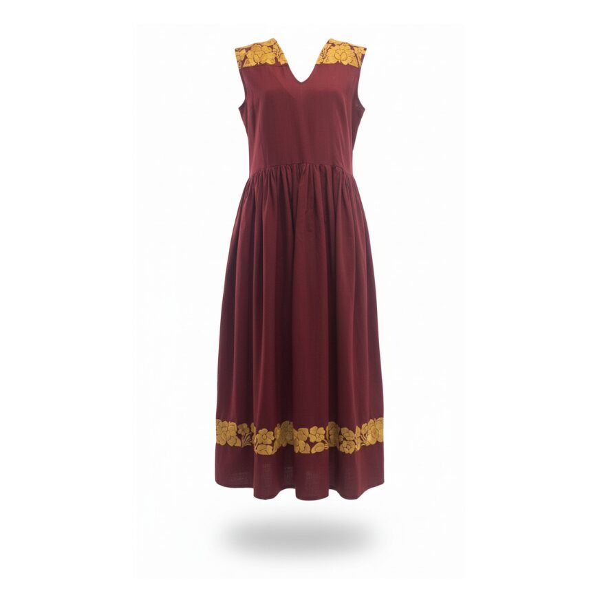 Nuestro vestido maxi formal bordado hecho a mano por las maestras artesanas del Istmo de Tehuantepec, con cuello “V”, sin mangas y su bordado de flores doradas en falda y hombros, destaca por su elegancia y su fuerte carga cultural. Nuestro vestido esta confeccionado en lino de color vino profundo, ideal para lucir en eventos formales de día o de noche, bodas o eventos sociales.