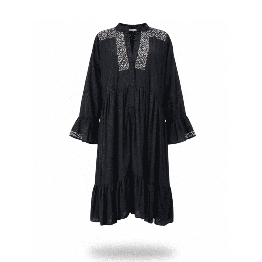 Vestido corto en un elegante color negro calado que añade un toque distintivo y refinado. Este diseño está adornado con un delicado bordado en blanco y negro, realizado a mano por las talentosas artesanas de San Vicente Coatlán. El contraste entre el negro calado y el bordado resalta la riqueza artesanal de la prenda, creando una pieza única que fusiona la tradición con la modernidad, ideal para quienes buscan una opción sofisticada y con carácter.