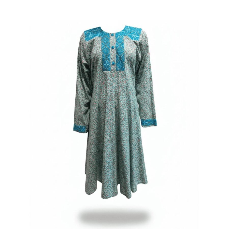Este vestido largo azul celeste está confeccionado en algodón estampado suave y ligero, ideal para brindar comodidad durante todo el día. Su diseño incluye mangas largas con delicado bordado en los puños y botonadura frontal en el pecho, complementado con un cierre oculto que aporta un acabado limpio, elegante y favorecedor.